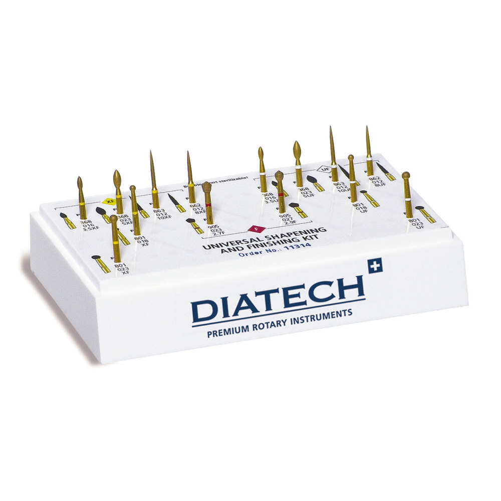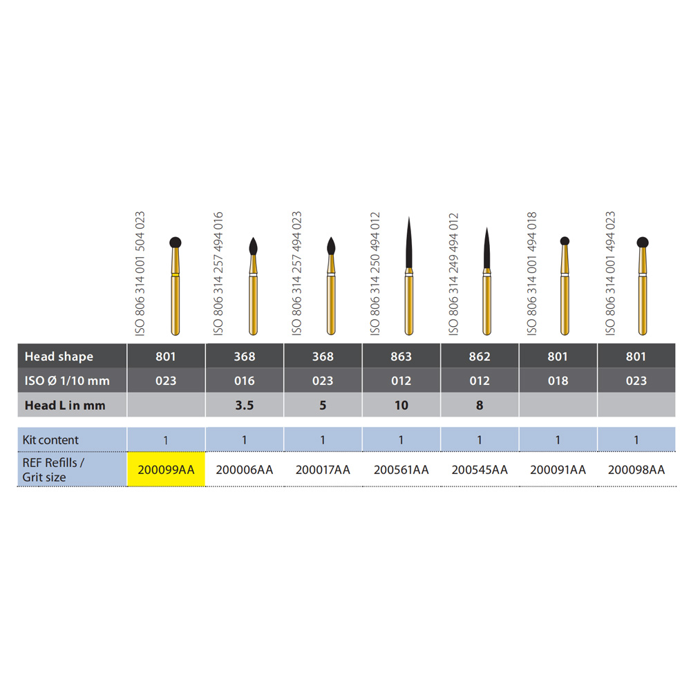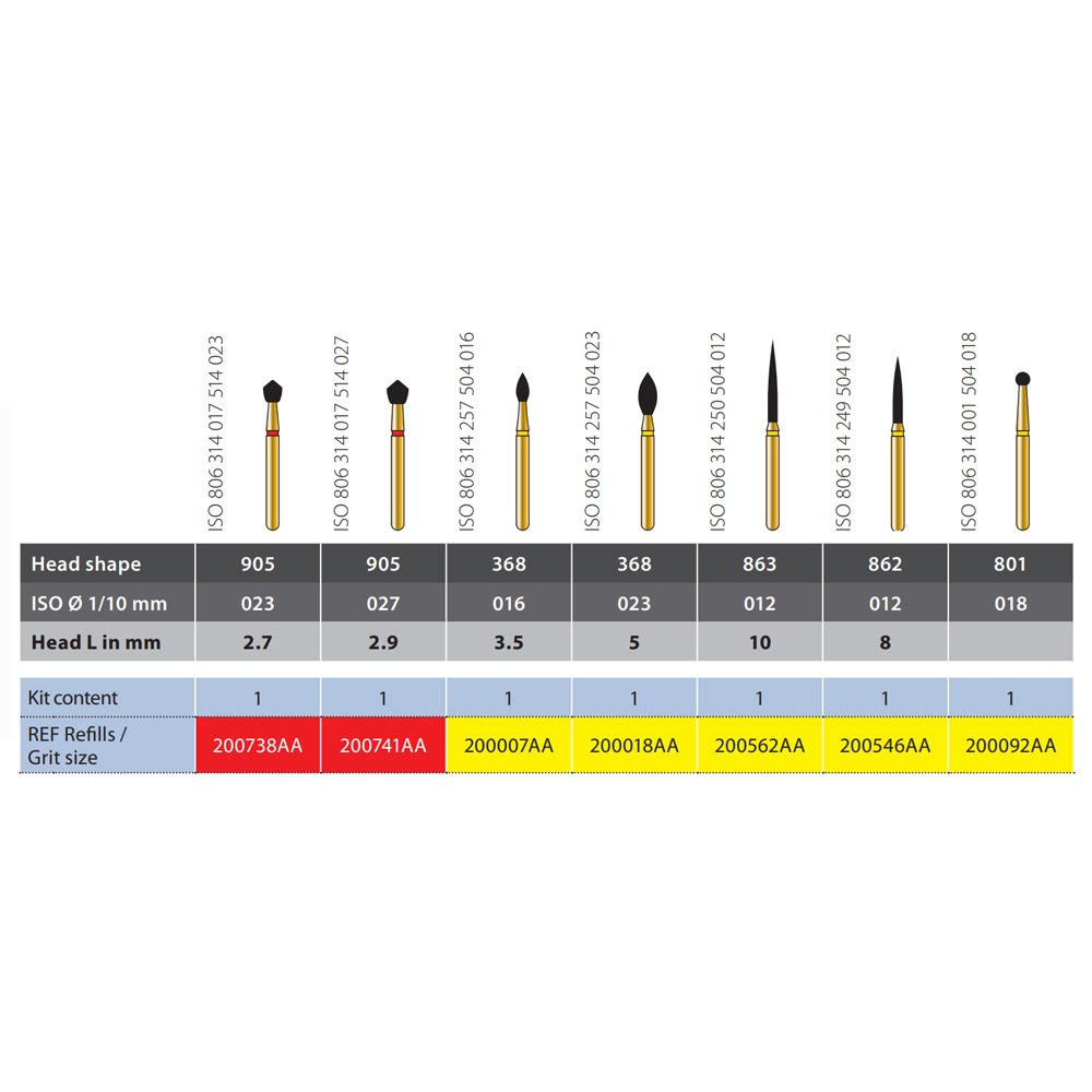 Set diamantových vrtáčikov pre dokončovanie amalgámových, kompozitných, kompomérových, keramických a zlatých výplní.