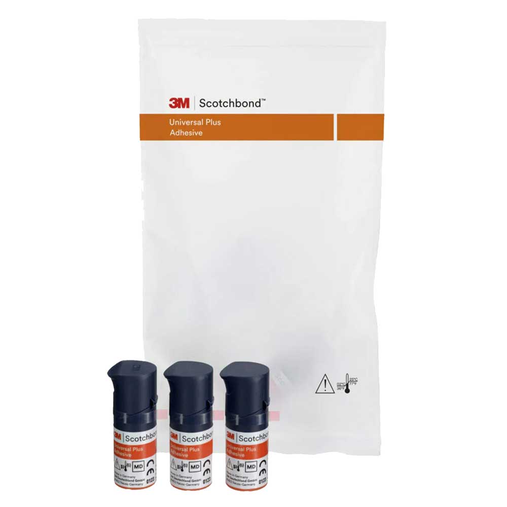 3M™ Scotchbond™ Universal Plus Adhesive prináša všetky benefity svojho predchodcu a pridáva väčšiu kontrolu a predvídateľnosť. Poskytuje zlatý štandard adhézie ku všetkým dentálnym substrátom, viaže sa na kariesom postihnutý dentín a utesňuje ho na podporu minimálne invazívnej stomatológie a vykazuje prakticky žiadnu pooperačnú citlivosť.* Zároveň ide o prvé univerzálne adhézivum s rádiopacitou podobnou dentínu.