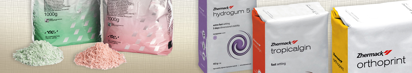 Alginátové odtlačkové hmoty a príslušenstvo na zhotovenie zubných odtlačkov v zubných ordináciách a laboratóriách, od výrobcov ako Coltene, Zhermack, GC a i.