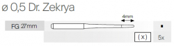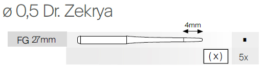 Vrták E0560 na použitie v chirurgii s frézovacou korunkou v tvare kužeľa, podľa Dr. Zekrya, priemer 0,5 mm, mandrel FG, dĺžka 27 mm, balenie 5 ks.