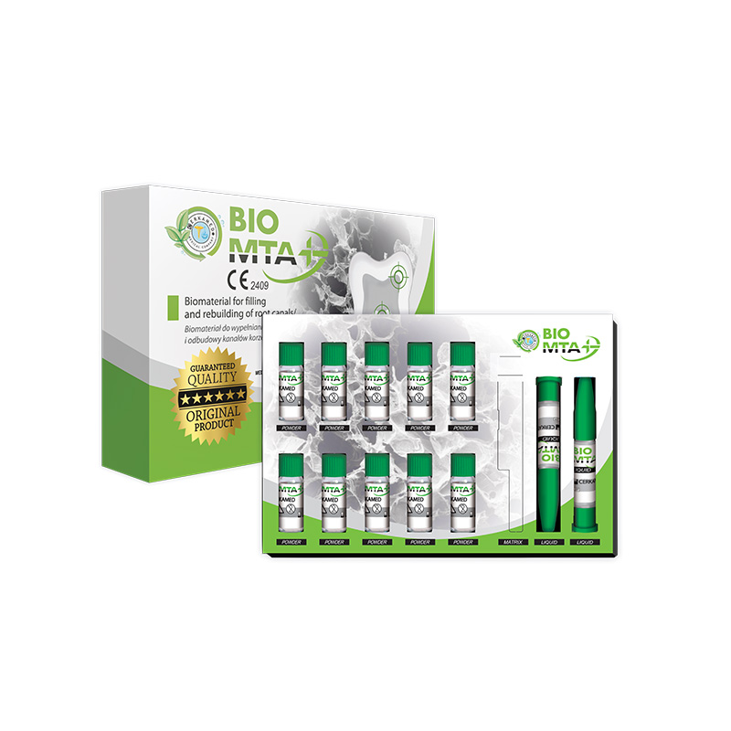 Bio MTA+ prášok: oxid vápenatý, hydroxyapatit, oxidy: kremík, železo, hliník, sodík, draslík, bizmut, horčík, zirkónium; fosforečnan vápenatý.