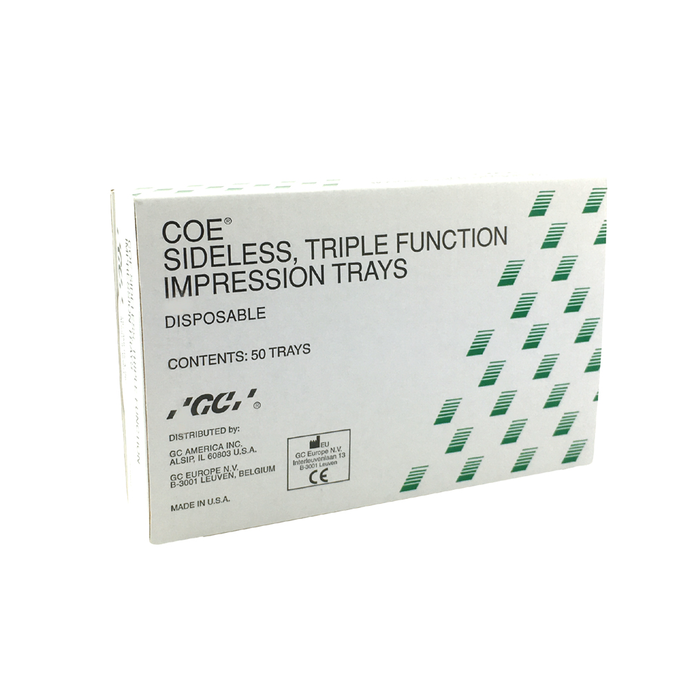 Plastové lyžice GC Sideless „Triple-Function“ (bez bokov, na tri účely) sa dodávajú v dvoch dieloch, ktoré po spojení tvoria plný oblúk. Ako už názov napovedá, nemajú bočné steny a to znamená, že každá polovica (alebo čiastočná lyžica, polovičná lyžica) je plne nastaviteľná do štyroch polôh, takže sa prispôsobí rôznym veľkostiam oblúkov. Každá polovica sa môže aj oddeliť na získanie odtlačku jedného kvadrantu.