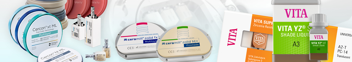 Široké portfólio materiálov (bločkov aj diskov) do frézovacích zariadení. V ponuke nájdete keramické, kompozitné aj hybridné materiály preodvšetkým pre zariadenia Cerec ale aj Amann Girrrbach. Okrem samotných blokov a diskov tu nájdete aj rôzne pomocné materiály.