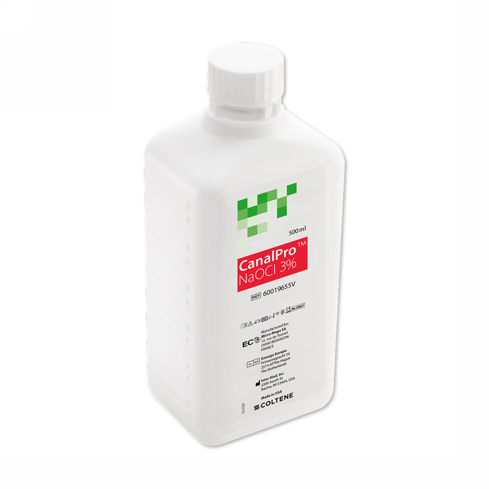 Roztok CanalPro NaOCl je dostupný v 3% a 6% zložení a je vhodný najmä na dezinfekciu dentínových tubulov a na rozpúšťanie organického materiálu.