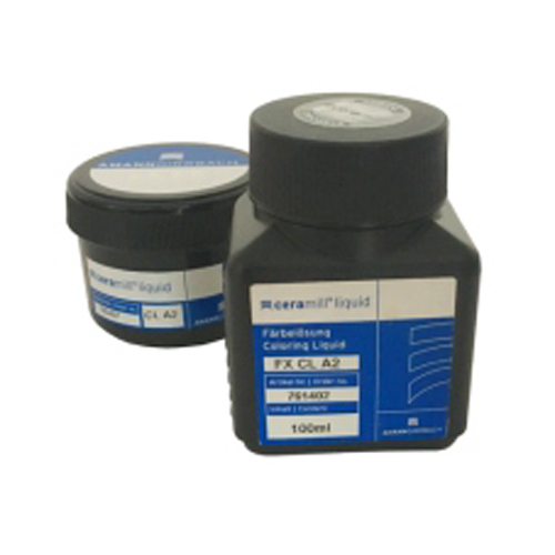 Farbiace kvapaliny pre Ceramill Zolid FX White. Zvláštnosťou super vysokej priesvitnosti zirkónia Ceramill Zolid FX je obzvlášť vysoká priepustnosť pre svetlo, ktorá ovplyvňuje tieňový efekt náhrady. Tieto svetlo-optické vlastnosti je potrebné vziať do úvahy pri výbere farbiacej kvapaliny. Ceramill Liquid FX bol vyvinutý podľa materiálových vlastností Ceramill Zolid FX, aby zaistil presné zafarbenie na základe klasických odtieňov VITA. Na prispôsobenie incisálnych/okluzálnych povrchov a pre oblasť ďasien sú k dispozícii ďalšie modifikátory odtieňa.
