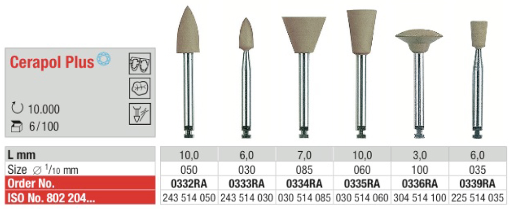 Jednostupňový / jednokrokový dokončovací a leštiaci systém vhodný na všetky výplne z porcelánu, čiastočné a celokorunkové náhrady. Leštiace nástroje Cerapol Plus s prirodzenou diamantovou zrnitosťou slúžia na leštenie porcelánových povrchov do vysokého lesku. Po úprave nie je potrebné druhé vypaľovanie glazúry. jednoduché použitie a časová úspora s optimálnou leštiacou kapacitou.