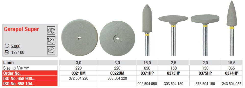 Leštiace nástroje na všetky výplne z porcelánu, čiastočné a celokorunkové náhrady, určené pre laboratóriá zubnej techniky. Leštiace nástroje Cerapol Super slúžia na leštenie porcelánových povrchov do vysokého lesku a vytvárajú prirodzené odlesky. Po úprave nie je potrebné druhé vypaľovanie glazúry.