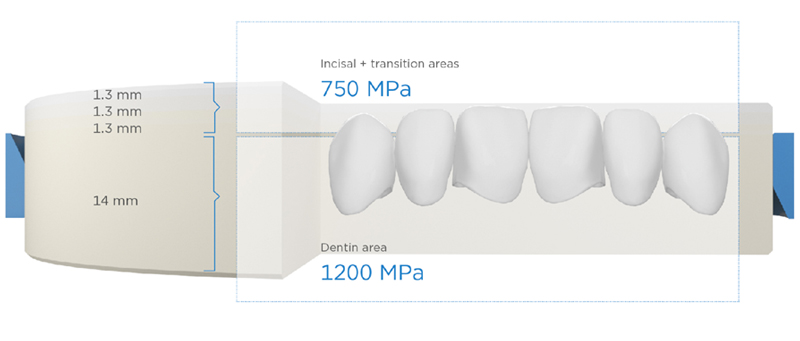 - Materiál je primárne určený na celoanatomické rekonštrukcie, je však možné pracovať aj technikou "Cut Back" s následným dovrstvením keramikou na zirkón (napr. Celtra Ceram)