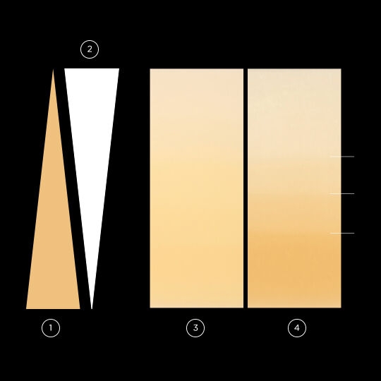 Porovnanie – plynulý verzus fázovitý gradient farbiva. Od cervikálnej (1) k incizálnej (2) časti je postupne v bloku čoraz menej pigmentu a časť bloku čoraz viac prepúšťa svetlo, pričom prechody medzi jednotlivými fázami nie sú viditeľné, ale celý tento priebeh je prirodzene plynulý. Plynulosť prechodu bloku CEREC MTL Zirconia (3). Väčšina konkurenčných zirkónov (4) využíva pri viacvrstvových blokoch staršiu technológiu, kde sú jednotlivé diferencované vrstvy markantné.