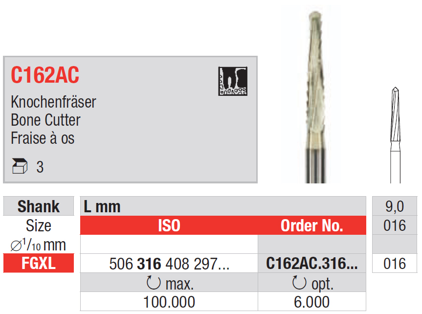 Chirurgická kostná fréza v tvare kónusu s tvrdým povlakom ZrN (nitrid zirkonitý), veľkosť 016, mandrel FGXL. viac o produkte