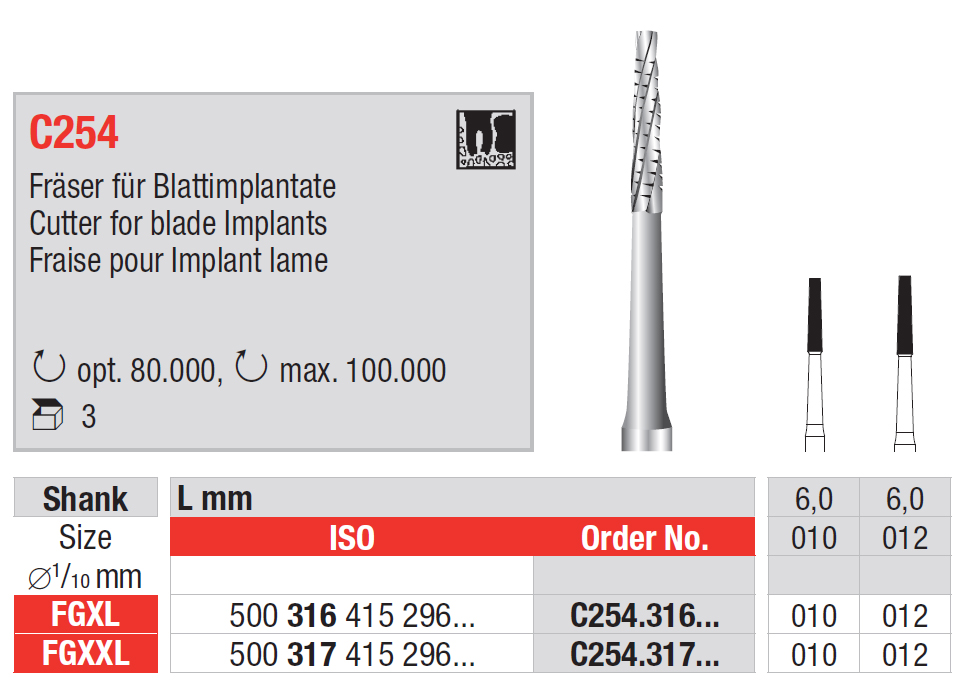 Chirurgická kostná fréza C254 na rezné implantáty, mandrel FGXL/FGXXL, veľkosti 010 a 012.