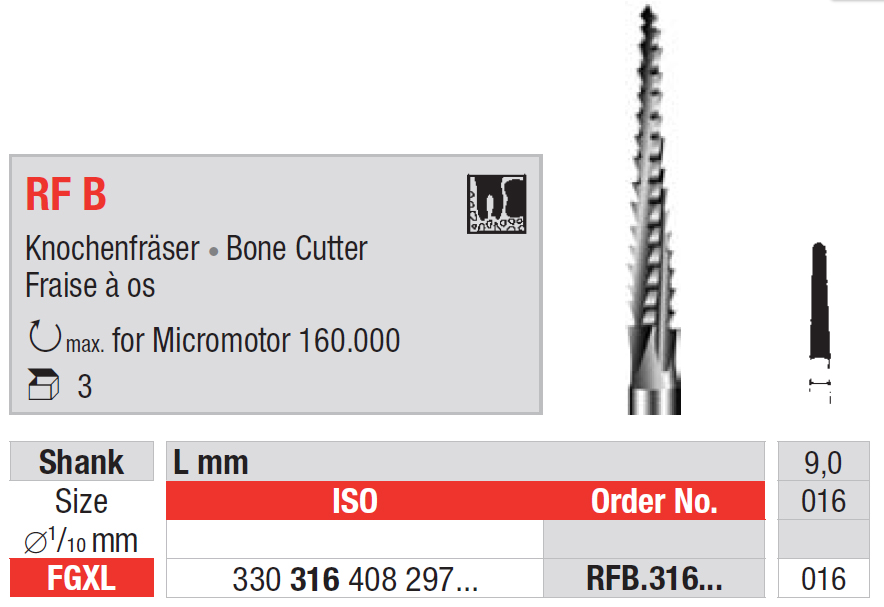 Chirurgická kostná fréza RF B, mandrel FGXL, driek 9,0 mm, veľkosť 016