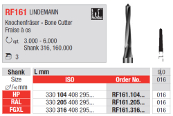 Chirurgická kostná fréza RF161 Lindemann, mandrel HP/RAL/FGXL, veľkosť 016.