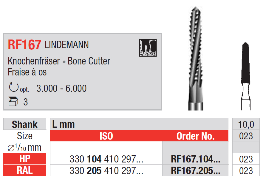 Chirurgická kostná fréza RF167 Lindemann, mandrel HP/RAL, veľkosť 023.