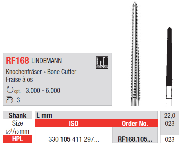 Chirurgická kostná fréza RF168 Lindemann, mandrel HPL, veľkosť 023.