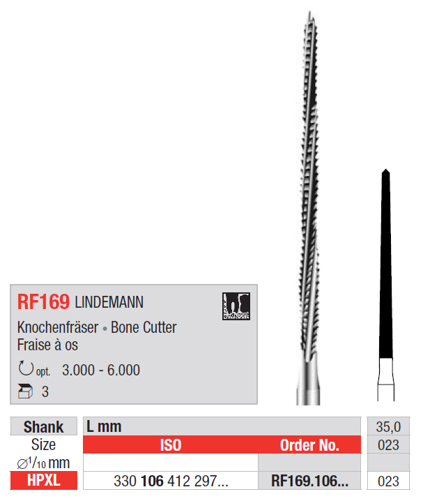 Chirurgická kostná fréza RF169 Lindemann, 35 mm dlhá, mandrel HPXL, veľkosť 023.