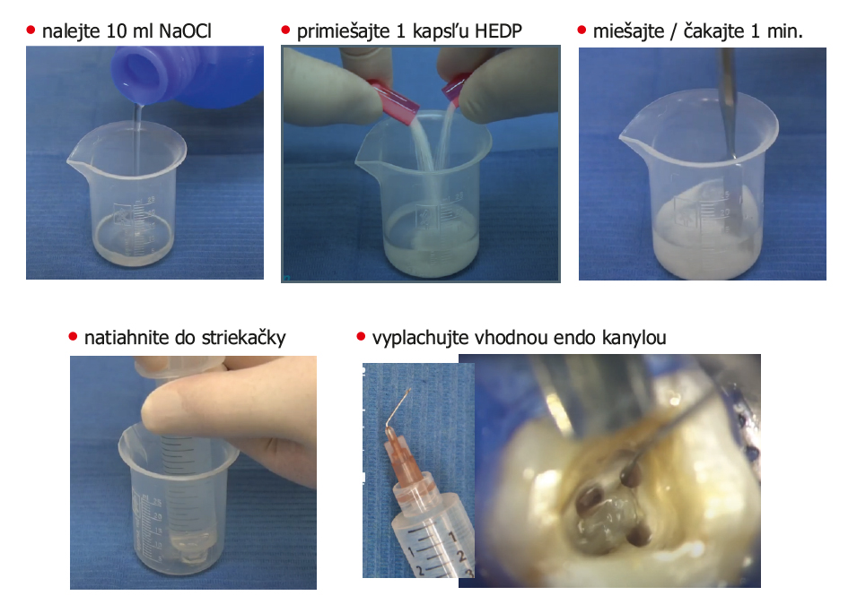 Postup: zmiešajte Dual Rinse HEDP v odmerke s 10 ml NaOCl a natiahnite do 10 ml injekčnej striekačky - týmto riešením sú všetky doterajšie komplikované vyplachovacie protokoly zastarané. Zmes Dual Rinse HEDP a NaOCl sa môže použiť počas inštrumentácie koreňového kanálika a tiež ako finálny výplach. Jedna kapsula obsahuje cca. 0,9 g prášku, ktorý sa zmieša s 10 ml roztoku hypochloridu sodného podľa vášho výberu priamo pred liečbou. Aby ste získali mierne dekalcifikačný roztok bez akýchkoľvek proteolytických vlastností, zmiešajte Dual Rinse® HEDP so sterilným fyziologickým roztokom (1 kapsula na 10 ml roztoku).