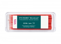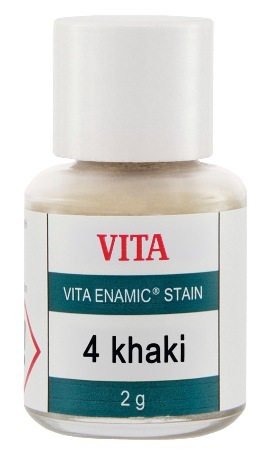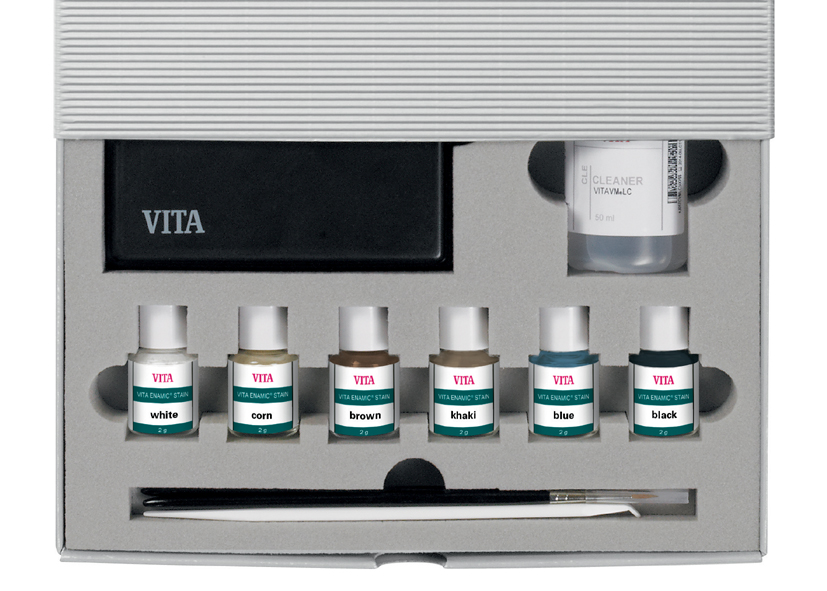 SÚPRAVA VITA ENAMIC STAINS KIT sa skladá zo šiestich farieb a príslušenstva na reprodukciu odtieňov prírodných odtieňov hybridných keramických náhrad. VITA ENAMIC GLAZE, dostupná na povrchovú úpravu, zvyšuje trvácnosť a žiarivosť odtieňov v ústach. Spracovanie je založené na jednoduchom princípe krok za krokom: povrch upravte, premiešajte a naneste odtiene, vykonajte intermediárnu polymerizáciu, naneste chemický glazúrovací materiál a vykonajte finálnu polymerizáciu.