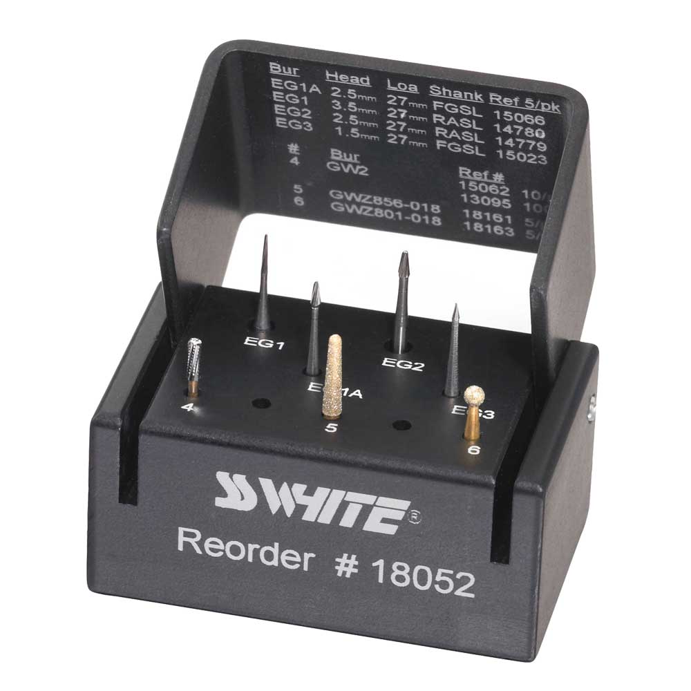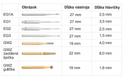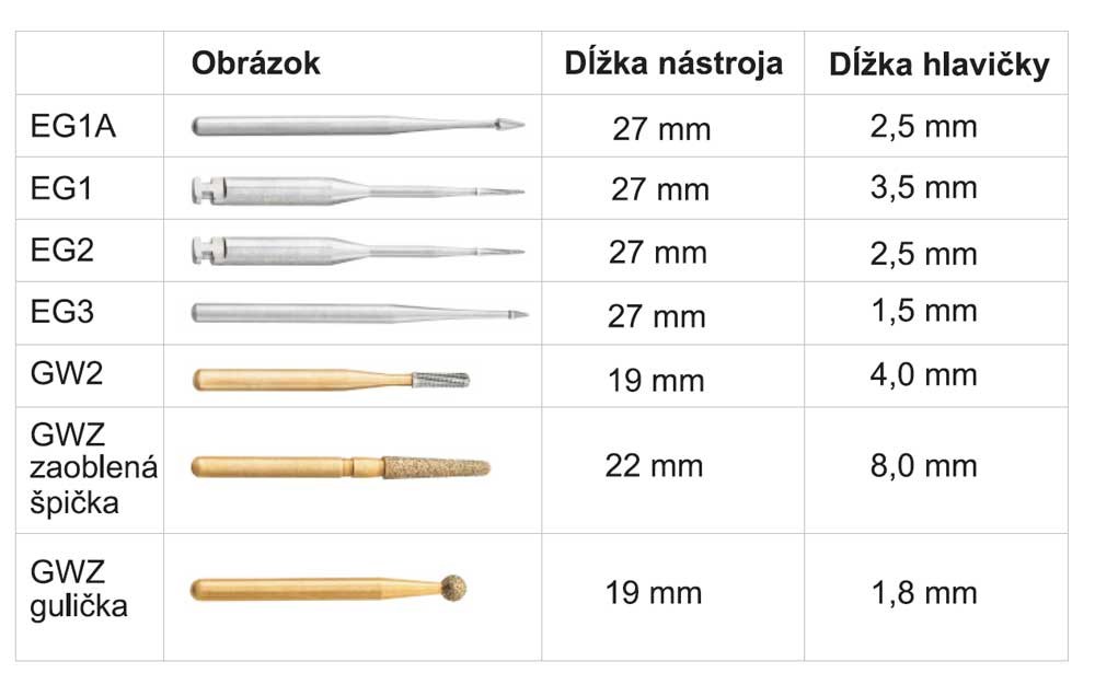 Kompletná sada vrtáčikov pre prístupovú kavitu anteriórnych a očných zubov vrátane vrtáčikov na rezanie kovu, keramiky a zirkónoxidu (GW2 a GWZ).