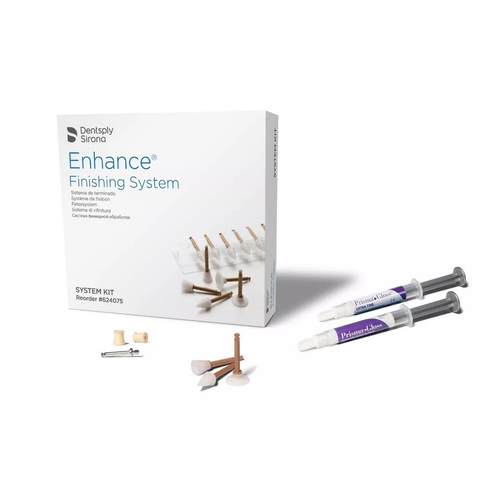 Systém Enhance Finishing and Polishing kombinuje niekoľko produktov určených na konečnú úpravu a leštenie všetkých typov živicových výplňových materiálov. Obsahuje vynikajúce hliníkové brusivo v špeciálnej živici. jednodielne nástroje úplne eliminujú možnosť poškodenia alebo odfarbenia výplne. Gumičky Enhance sú dostupné v troch rôznych tvaroch a používajú sa na leštenie v spojení s leštiacou pastou Prisma Gloss. Prisma Gloss a Prisma Gloss Extra Fine sú leštiace pasty na kompozity, ktoré vytvárajú „mikrojemný“ povrch na hybridných kompozitoch. Výrobok neobsahuje žiadne nebezpečné chemikálie, a preto nevyžaduje kartu bezpečnostných údajov.