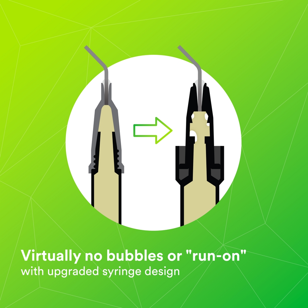 Dizajn striekačky minimalizuje bubliny a zabraňuje „roztekaniu“ materiálu.
