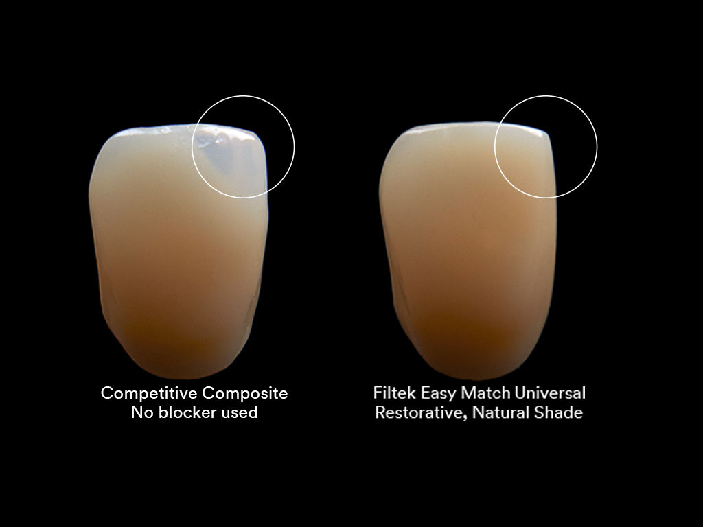 Na rozdiel od niektorých konkurenčných jednoodtieňových kompozitov (vľavo) nepotrebuje Filtek Easy Match Restorative (vpravo) blokátor. Poskytuje krytie podobné dentínu pri hrúbkach väčších ako 2 mm a priesvitnosť podobnú sklovine pri hrúbkach 0,5-1 mm.