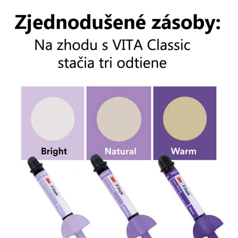 • Len tri odtiene (svetlý, prirodzený a teplý), ktoré zodpovedajú vzorkovníku odtieňov VITA Classic
