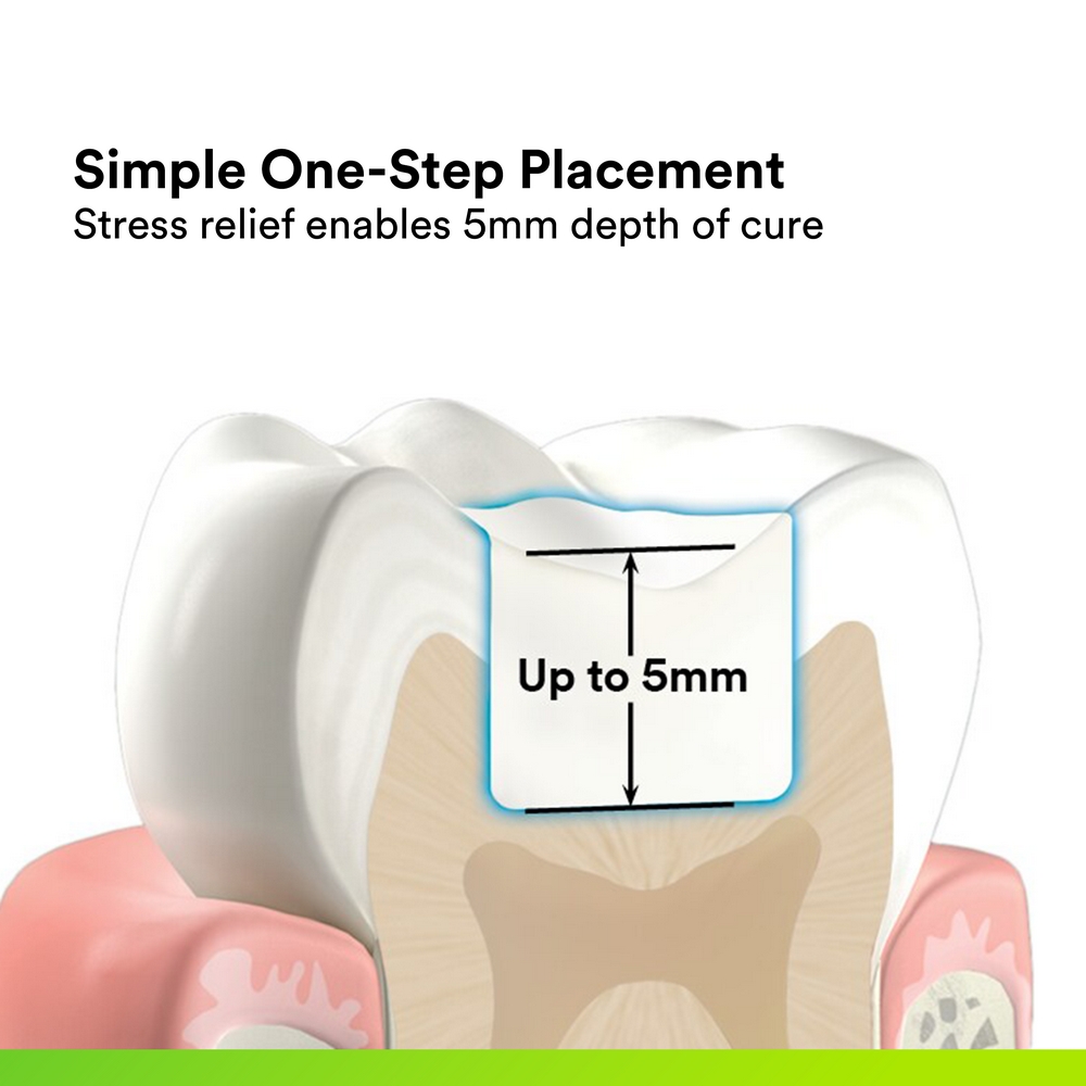 • Vyplnenie v jednom kroku Vďaka mechanizmu uvoľňovania polymerizačného napätia je možné aplikovať vrstvu až do 5 mm bez potreby vrstvenia