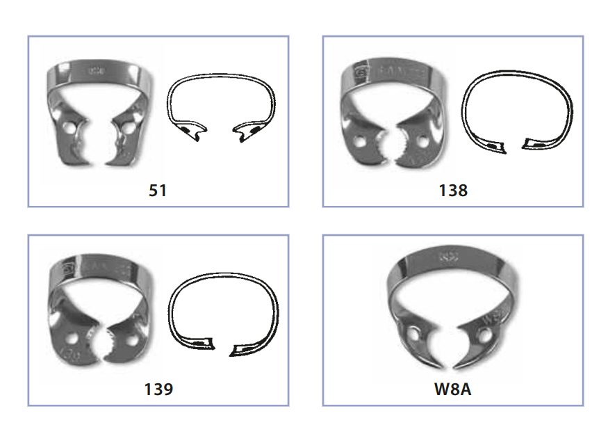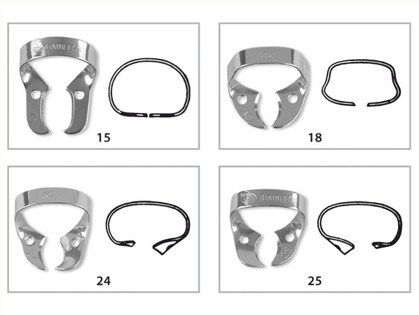 Spona na moláre bez krídelok. Spony na koferdamy Fit Rubberdam sú vyrobené z 0,66 mm hrubej nehrdzavejúcej ocele a každá je presne a účinne uspôsobená pre konkrétny typ zubu.