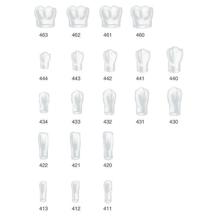 Priesvitné korunky nemeckého výrobcu Frasaco pre pravú dolnú časť chrupu, čísla 411 až 463.