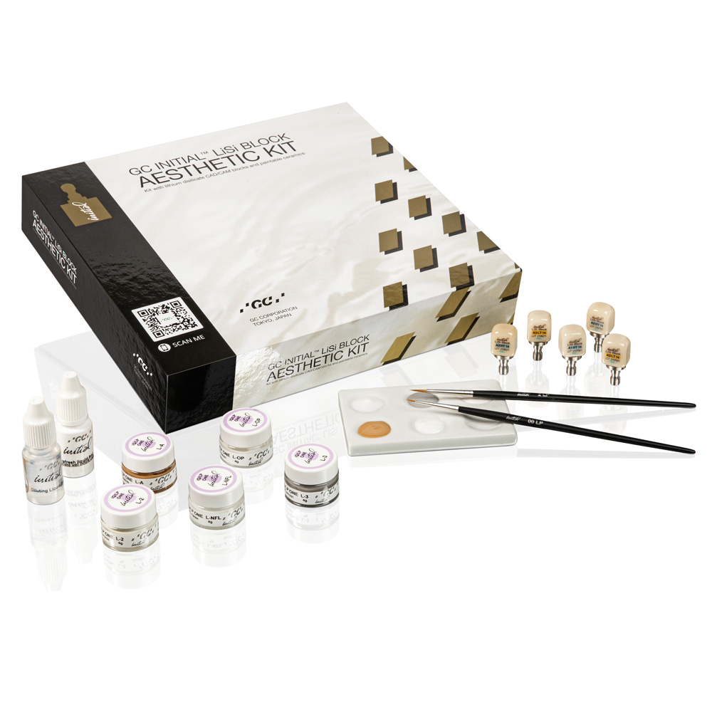 Sada líthiumdisilikátových bločkov Initial LiSi Blocks, dofarbovacích hmôt Lustre Paste One a príslušenstva pre estetické celokeramické rekonštrukcie zhotovené CAD/CAM postupom.