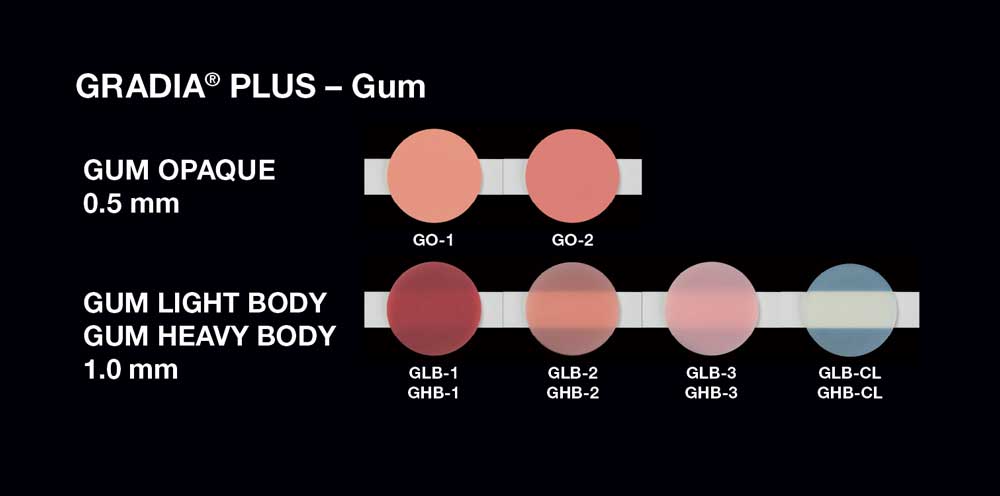 Rovnako ako prirodzené odtiene zuba ponúka systém Gradia Plus aj riešenie pre komplexné prípady "červenej estetiky". Gradia Plus ponúka ďasnové odtiene ktoré reprodukujú gingivu pri indikáciách ako sú supraštruktúry na implantátoch, a iné fixné a snímateľné práce ako korunky, mostíky a čiastočné náhrady. Široká ponuka červených odtieňov umožňuje verne napodobniť gingiválne tkanivo pacienta vo farbe a textúre bez ohľadu na vek a etnicitu. Odtiene sú dostupné v konzistenciách Light Body a Heavy Body, čo umožňuje zvoliť najvhodnejšiu konzistenciu pre daný prípad.
