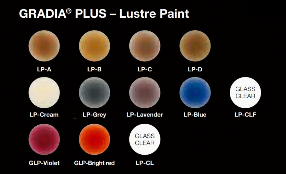 12 odtieňov Gradia Plus Lustre Paint poskytuje veľmi jednoduchý spôsob ako dodať dlhotrvajúce sfarbenie a povrchový lesk. Naviac vďaka inovovanej technológii nanoplniva dosiahnu vaše práce vysoku odolnosť voči opotrebeniu. Je možné vybrať širokú paletu odtieňov pre internú a externú charakterizáciu. Môžu sa jednoducho miešať pre dosiahnutie ešte viac farebných nuansov. Môžete si namiešať svoju obľúbenú konzistenciu vďaka Lustre Paint Diluting Liquid. S použitím svetlom tuhnúcej vrstvy na povrchu skracujete fázu lešteia čim šetríte drahocenný čas.