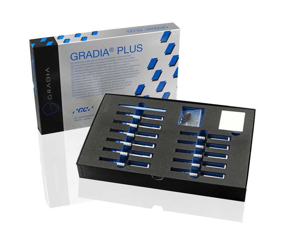 5x GRADIA PLUS Opaque 2.0ml O-Base, OA, OB, OC, OD, 1x GRADIA PLUS Paste Light Body 2.0ml LB-Base OD, 5x GRADIA PLUS One Body 2.0ml LB-A, LB-B, LB-C, LB-D, LB-W, 10x GRADIA PLUS Dispensing Tip Plastic Type Wide & Light Protective Cover, 5x GRADIA PLUS Dispensing Tip Needle Tip & Light Protective Cover, 1x Mixing Pad N° 22, 1x Plastic Spatula N° 2 Blue