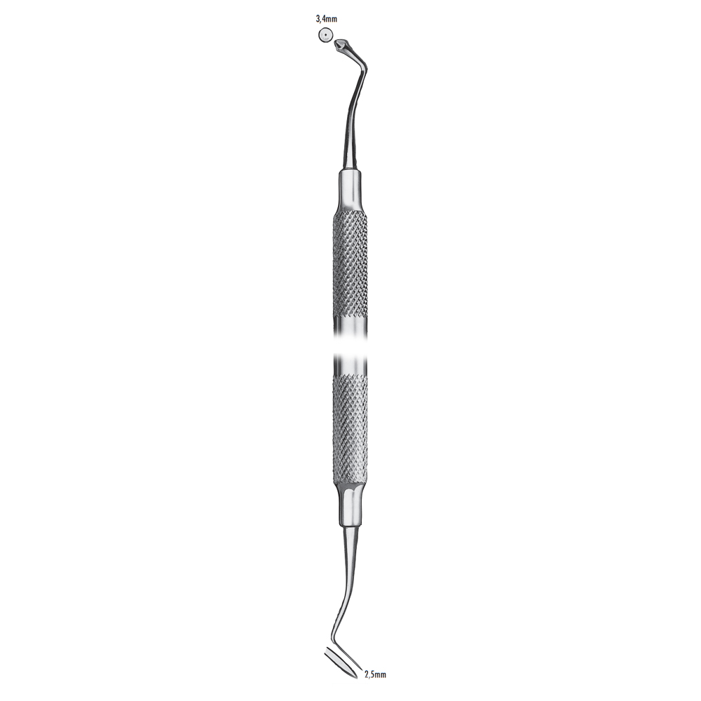 Obojstranný nerezový nástroj na tvarovanie výplní, priemery hrotov 3,4 mm a 2,5 mm, celková dĺžka 16,7 cm.