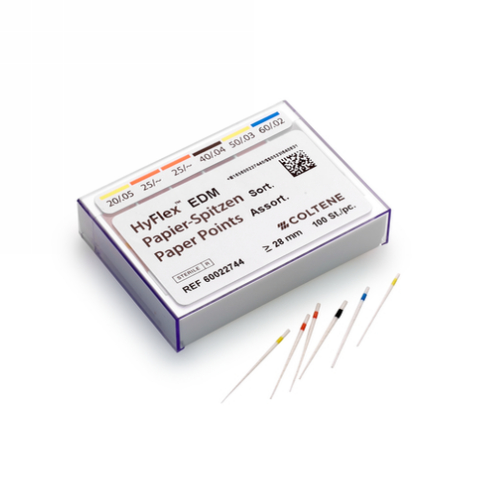 Papierové čapy HyFlex EDM sú ideálne na sušenie koreňových kanálikov, ktoré boli preparované endonástrojmi HyFlex EDM. Priemer zodpovedá veľkostiam ISO, konicita zodpovedá nástrojom EDM. Miešané balenie 100 kusov.