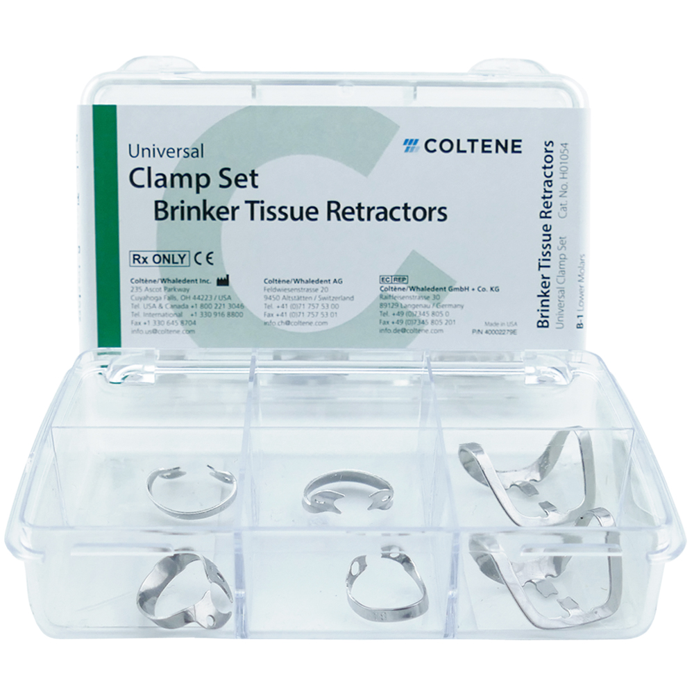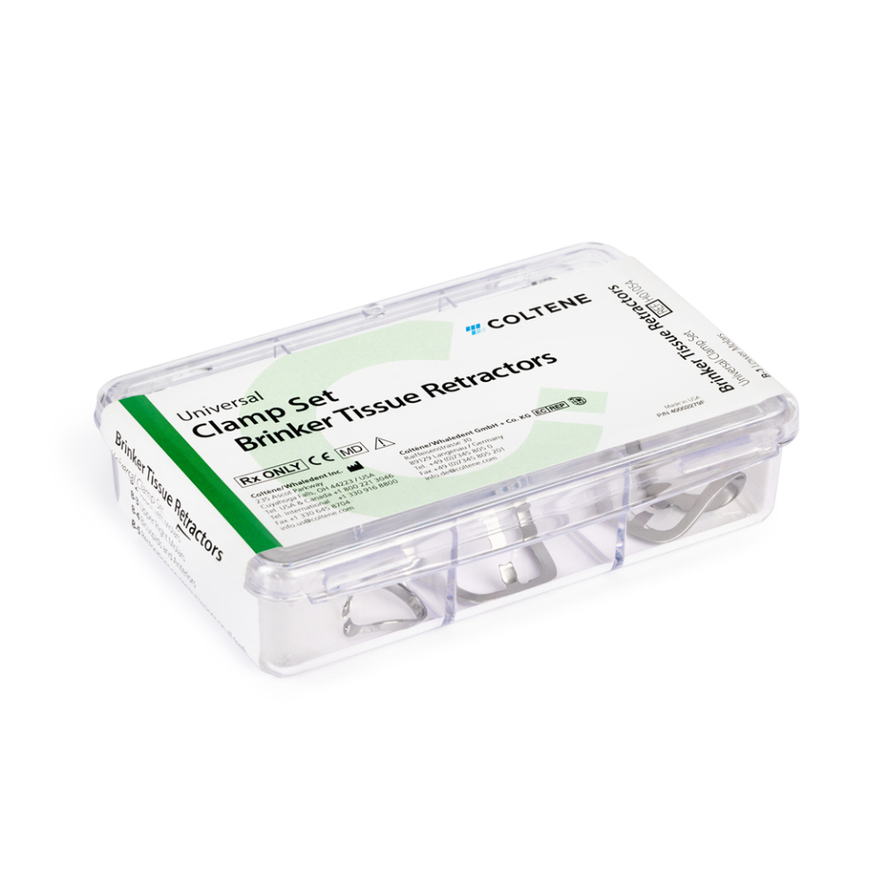 Atraumatické retrakčné koferdamové spony. Tvar a zaoblené hrany zaisťujú maximálnu šetrnosť ku mäkkým tkanivám. Extra sklonené "zobáky" poskytujú maximálne stiahnutie bez lacerácie tkanív ďasien.
