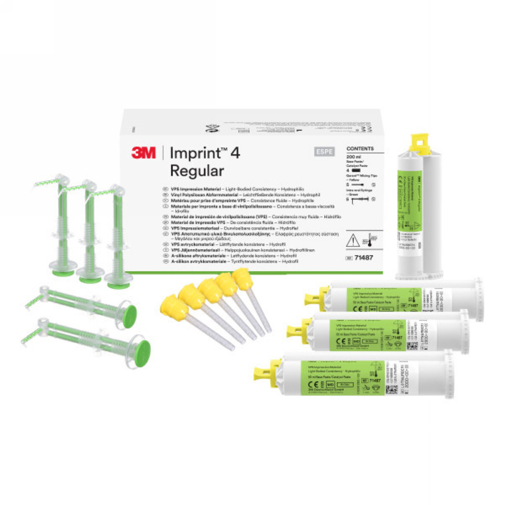 popis: Imprint 4 Regular (4ks krém 50 ml, 5x miešacia kanyla žltá, 5x 3M™Intraorálna striekačka zelená) Katalógové číslo výrobcu: 71487 |