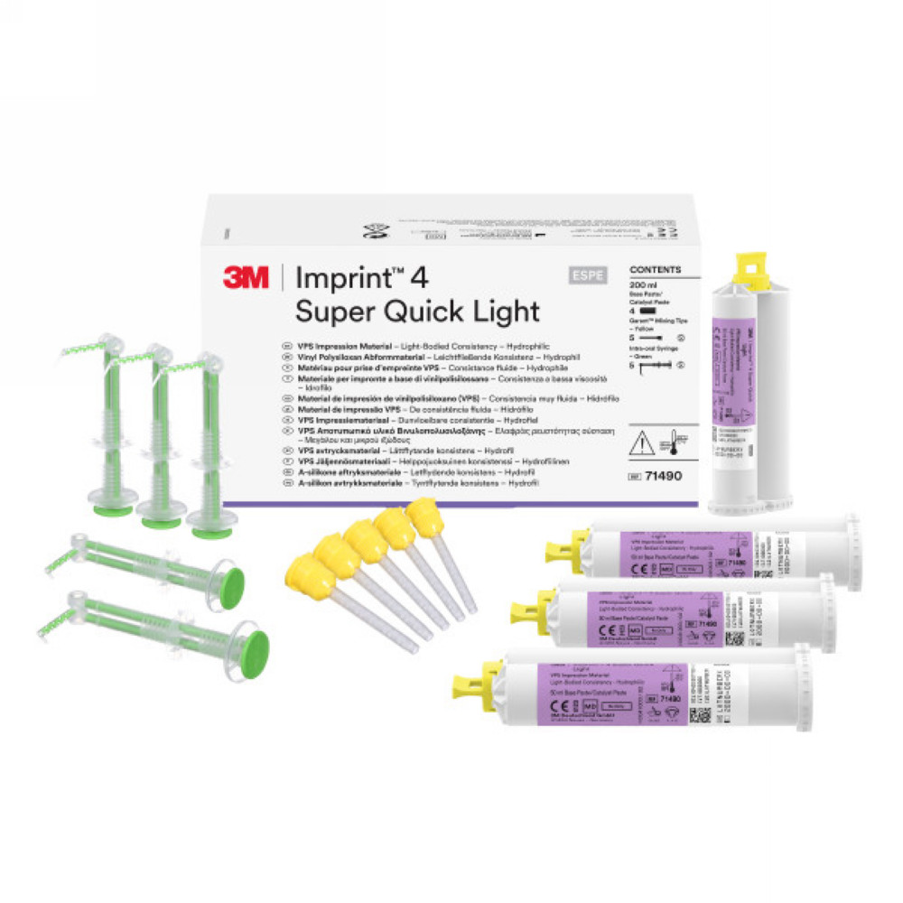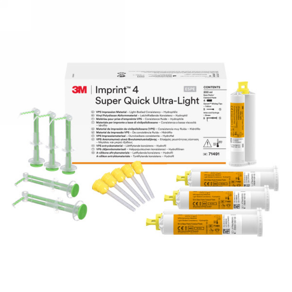popis: Imprint 4 Super Quick Ultra Light (4ks krém 50 ml, 5x miešacia kanyla žltá, 5x 3M™Intraorálna striekačka zelená) Katalógové číslo výrobcu: 71491 |