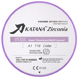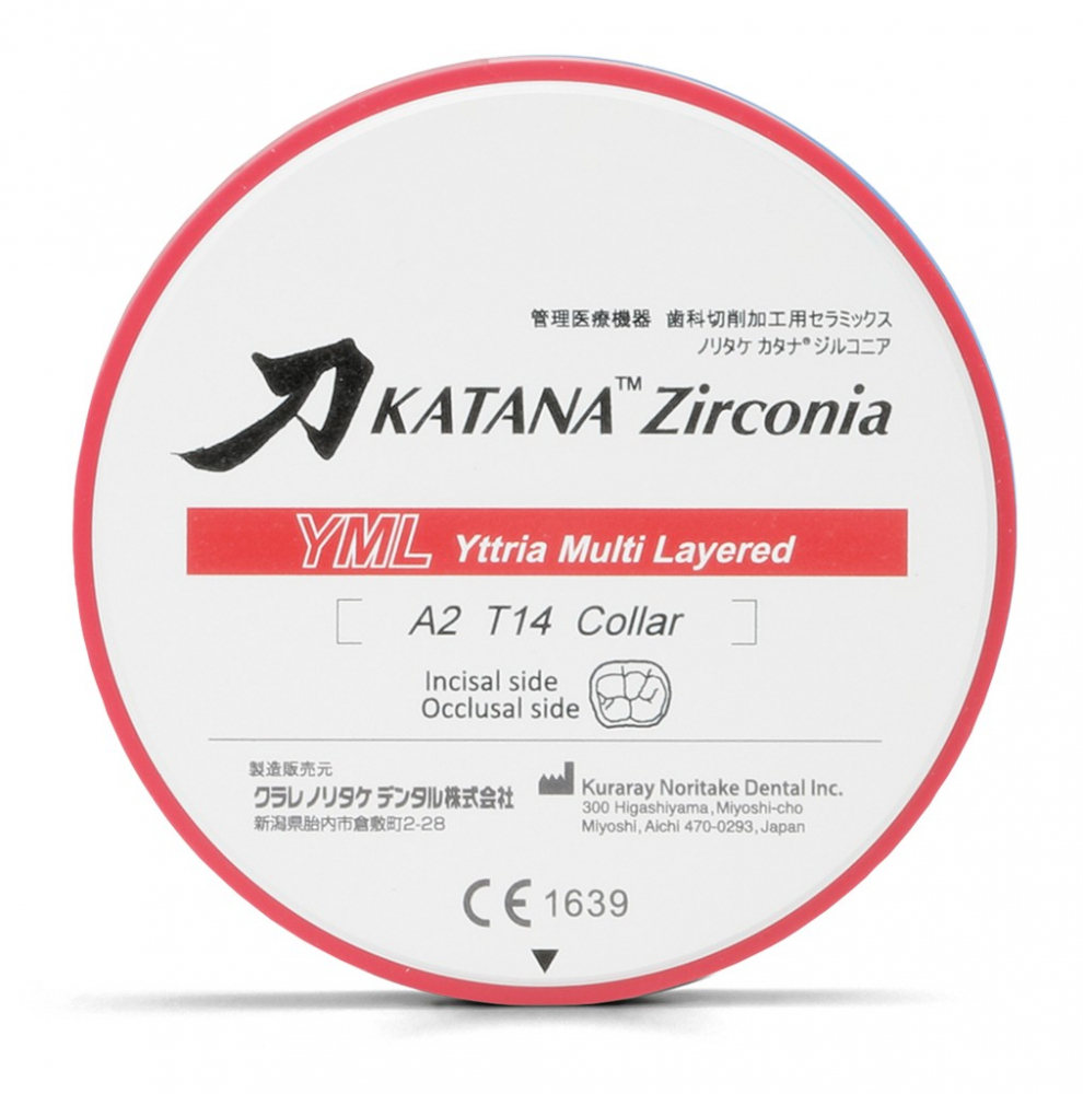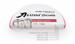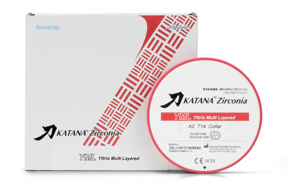 Disk Katana YML pozostáva zo 4 vrstiav zirkónového materiálu s rôznymi koncentráciami ytria a zodpovedajúcimi mechanickými a farebnými vlastnosťami. Výsledkom je efekt plynulej gradácie jasu a translucencie bez viditeľných prechodov a s garantovanou vysokou pevnosťou v ohybe – to všetko v materiáli "všetko v jednom", ktorý je možné indikovať pre celé spektrum prác: