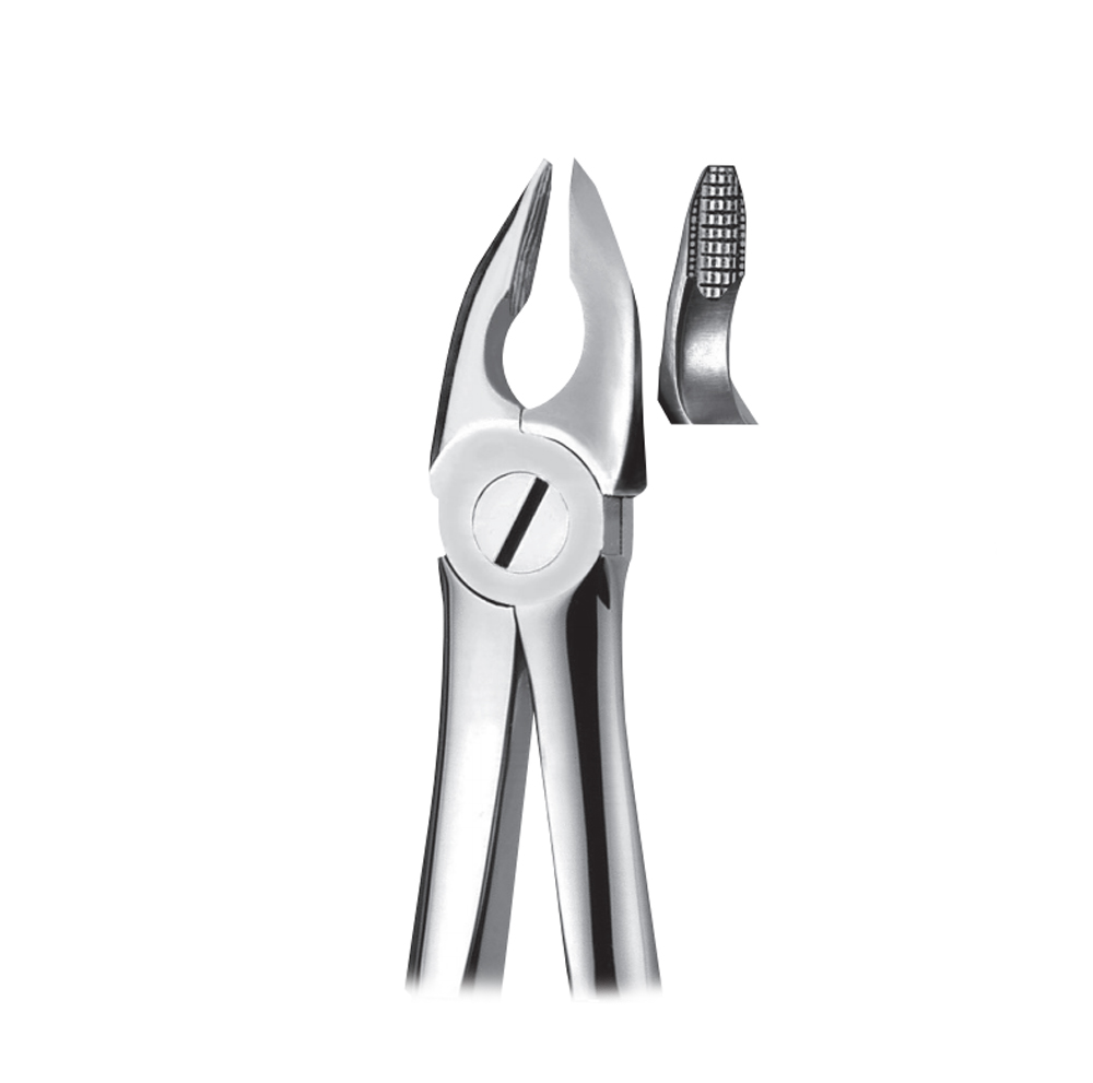 Nerezové kliešte na extrakciu horných premolárov. Úzke čeľuste pevne a hlboko zvierajú oblasti krčka zubu. Čeľuste sú na každej strane ploché, čím je uľahčené otáčanie aj pri hlbšom zasunutí, čo umožňuje voľnejšie otáčanie zuba než pri použití štandardných klieští.