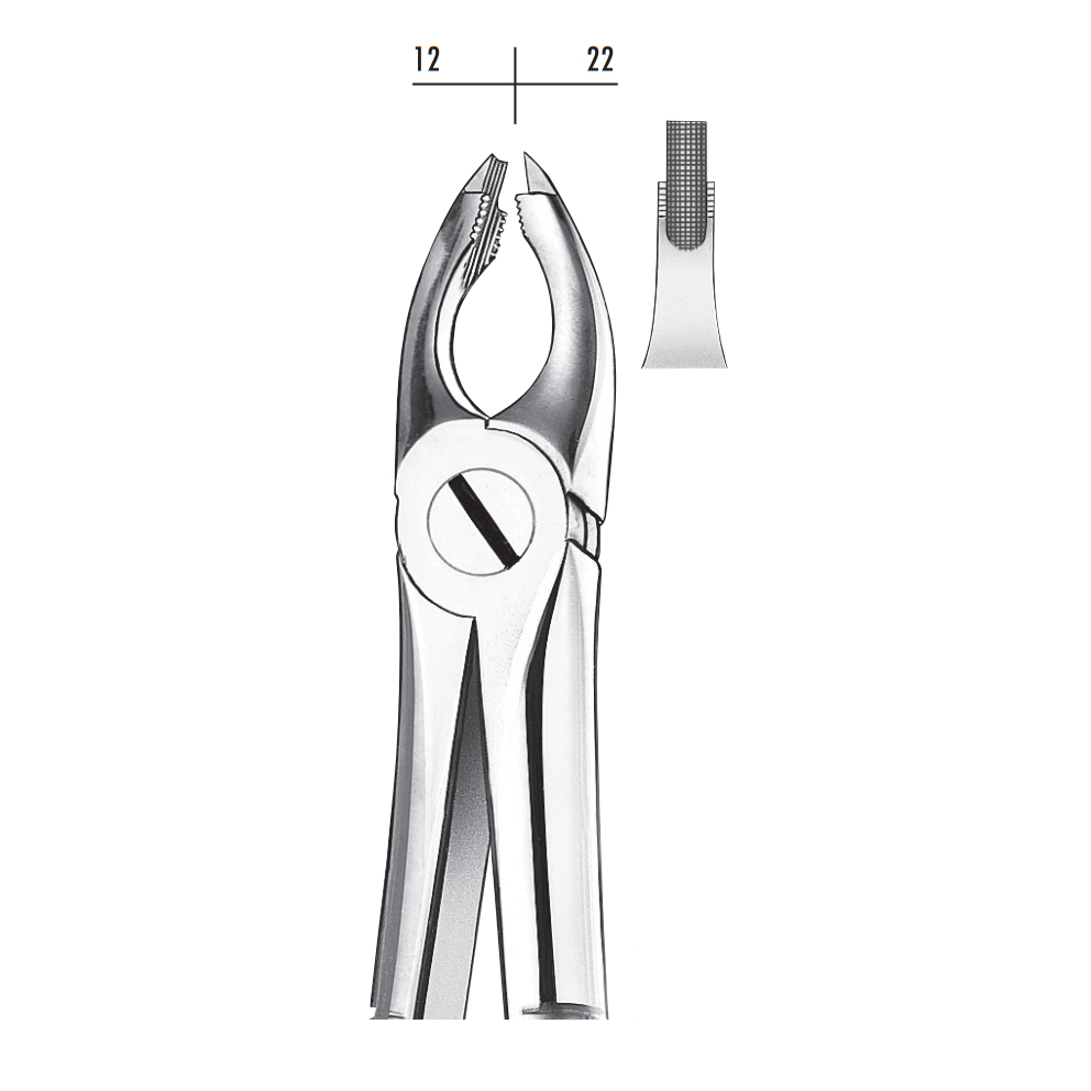 Kliešte na extrakciu horných stredných rezákov a očných zubov, premolárov, dĺžka 16,2 cm.