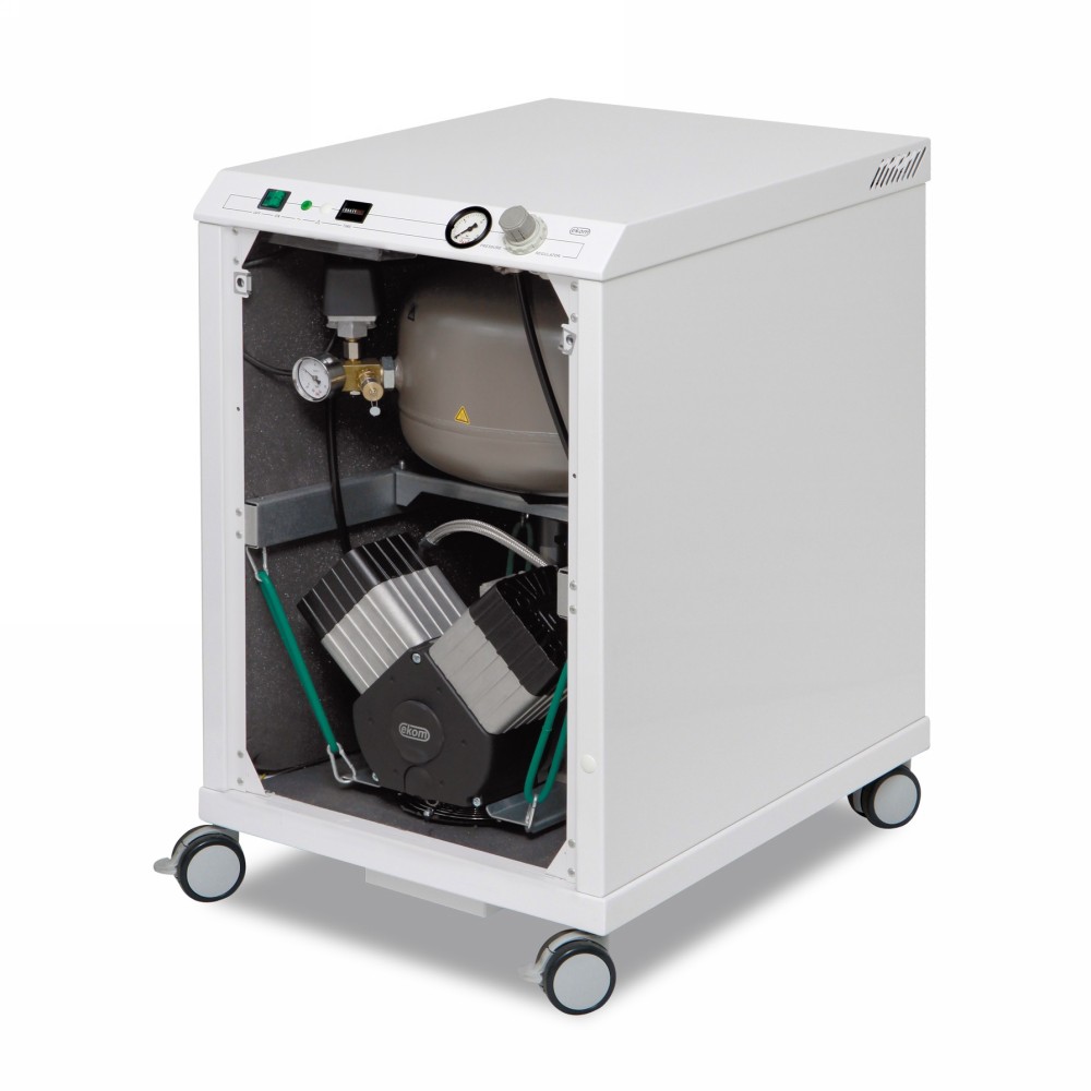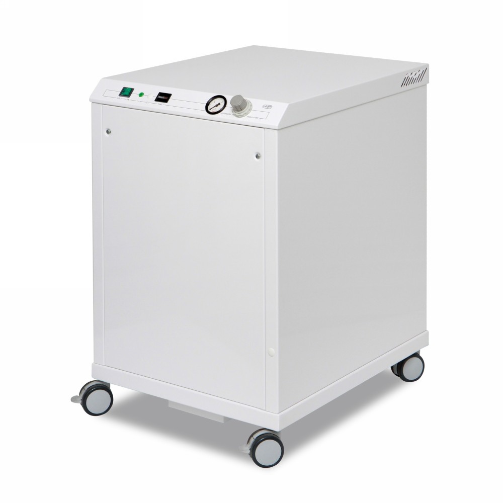 Bezolejový dvojvalcový kompresor v kompaktnej mobilnej skrinke, svojou výškou vyhovujúci k umiestneniu pod štandardné laboratórne stoly a nábytok. Zahŕňa membránový sušič a skrinku.