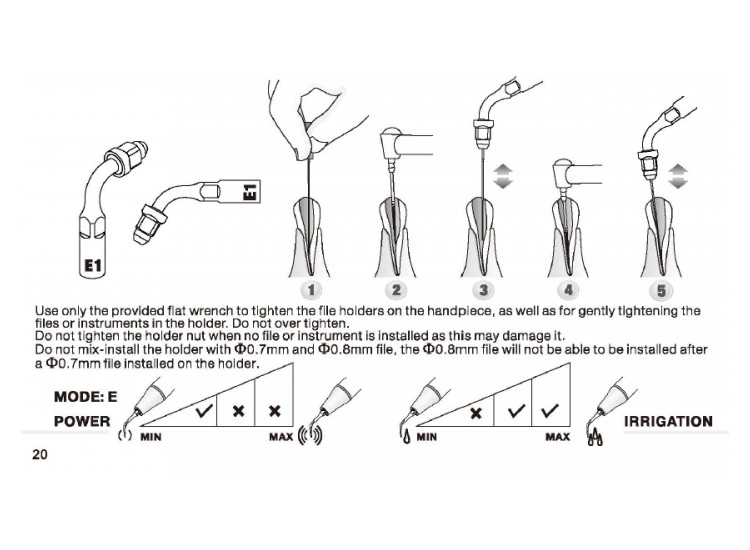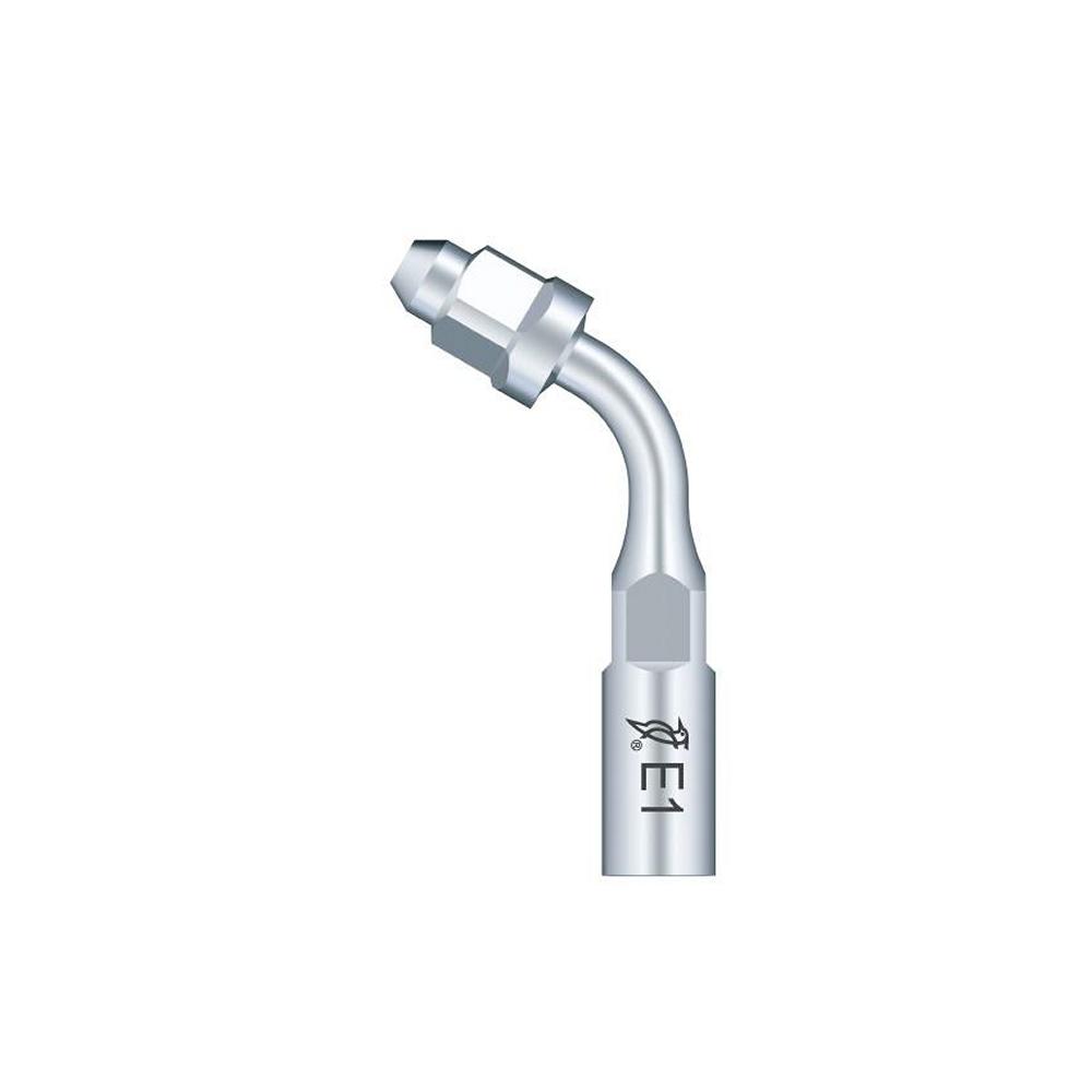 Držiak so zahnutím 120° na nástroj s priemerom 0,7 mm alebo 0,8 mm pre systémy EMS. Vhodný na čistenie alebo irigáciu koreňového kanálika, typicky sa používa na predné zuby. Nemiešajte veľkosti nástrojov – po inštalácii nástroja s priemerom 0,7 mm už nebude možné inštalovať rozmer 0,8 mm.