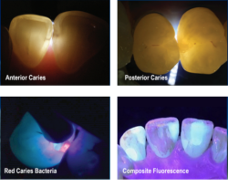 • vizualizácia biofilmu, plaku, zubného kameňana detekciu a analýzu baktérií na základe ich fluorescenčných vlastností
