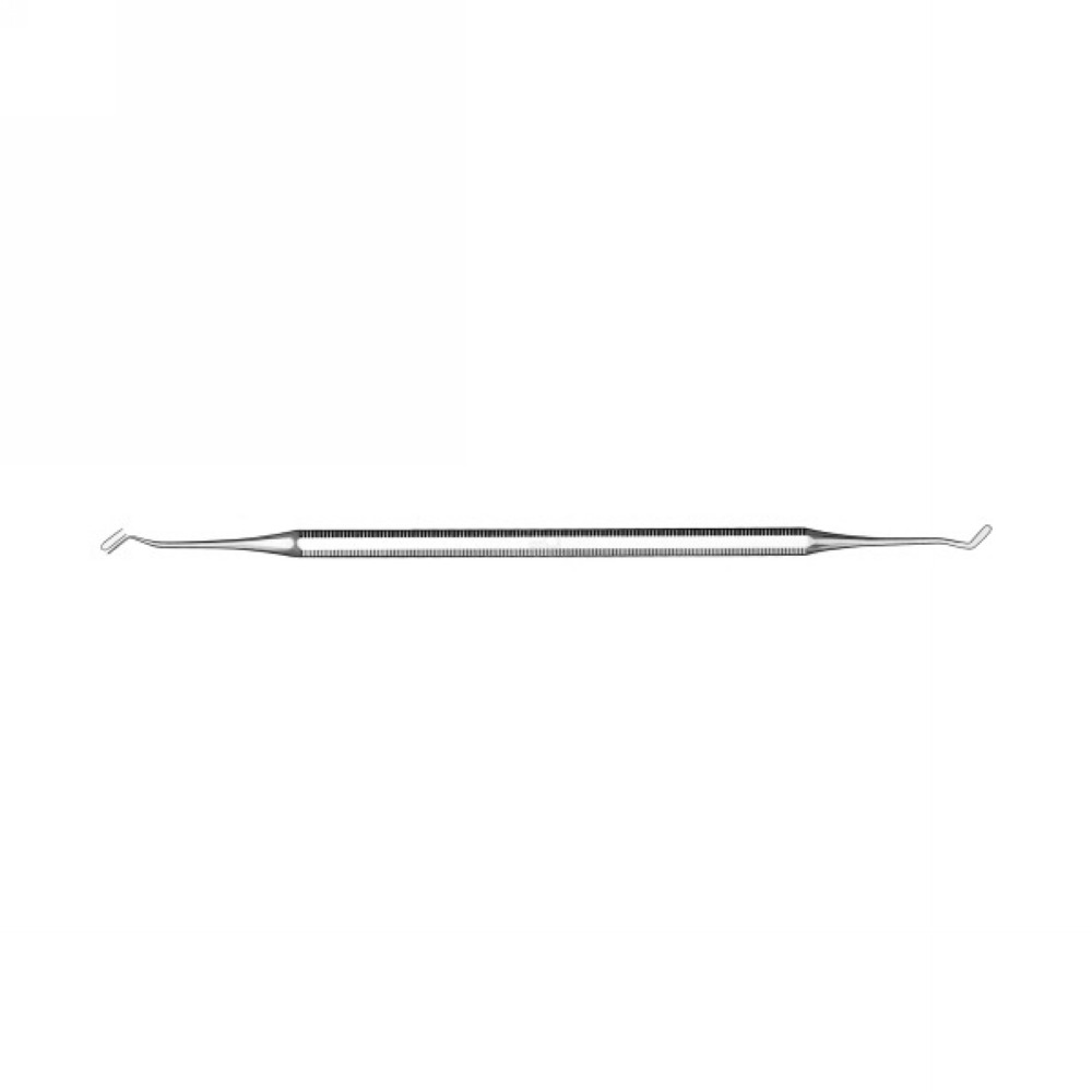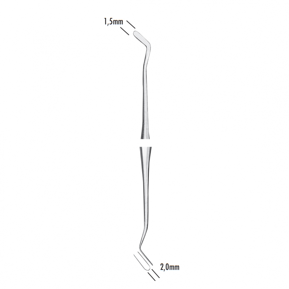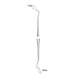 Obojstranný nástroj z ušľachtilej ocele na spracovanie a tvarovanie výplní, osemhranná rukoväť, rozmer plochých pracovných koncov 1,5 a 2,0 mm, celková dĺžka 17,4 cm.
