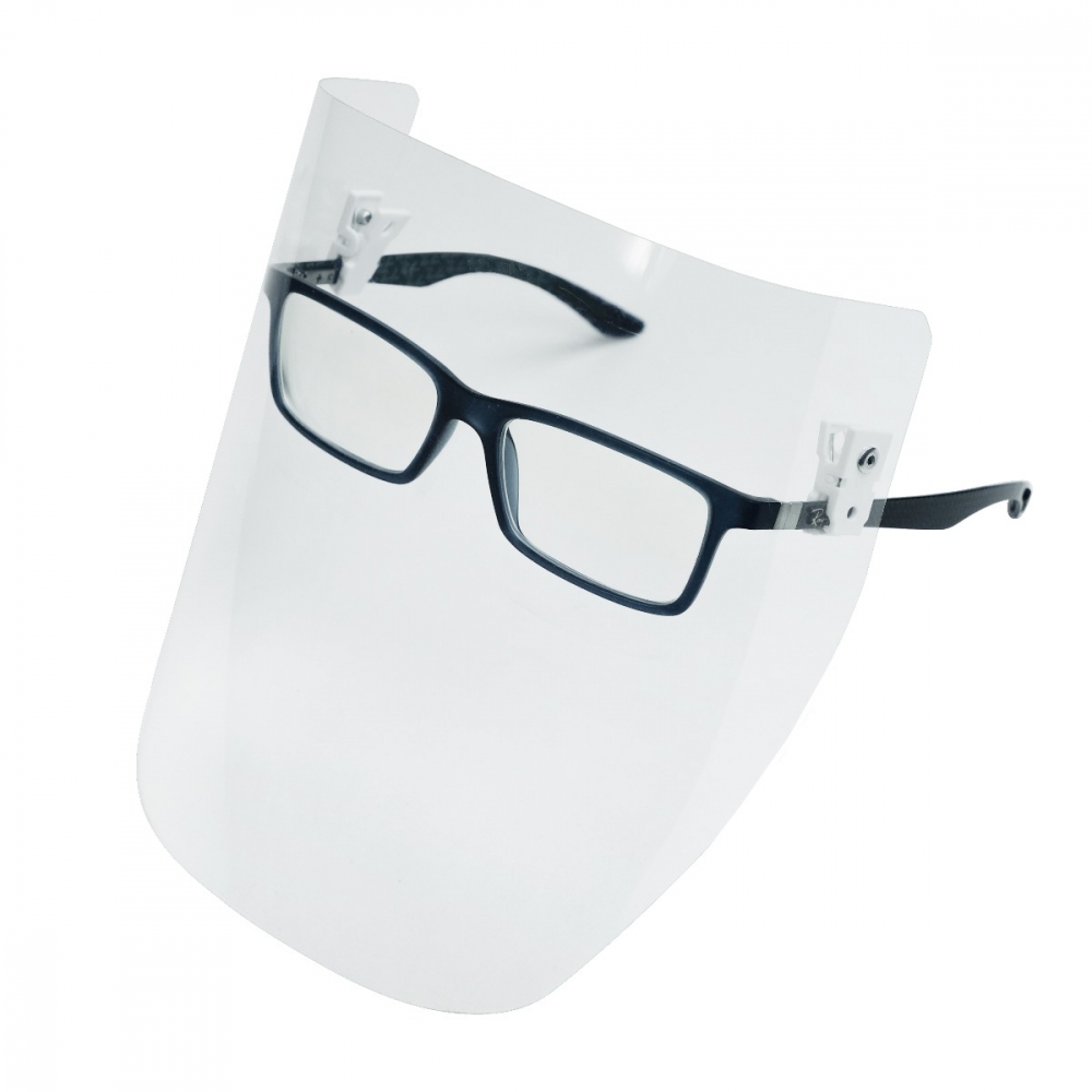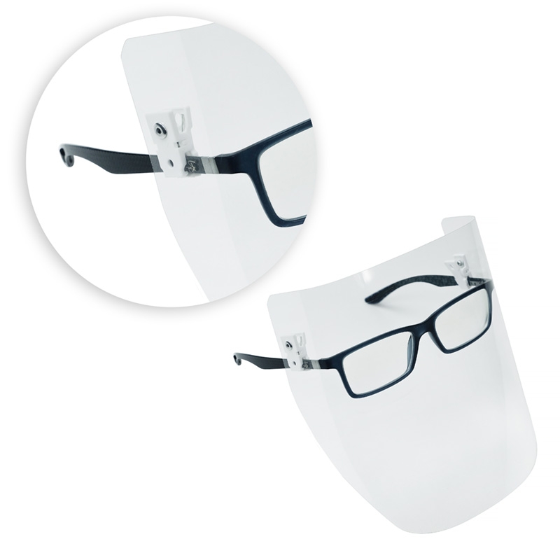 Opatrne vyberte štít z obalu, pričom dbajte na to, aby ste ho nevystavili nečistotám a poškriabaniu. Nasaďte štít na dioptrické okuliare pomocou pripevnených spôn.