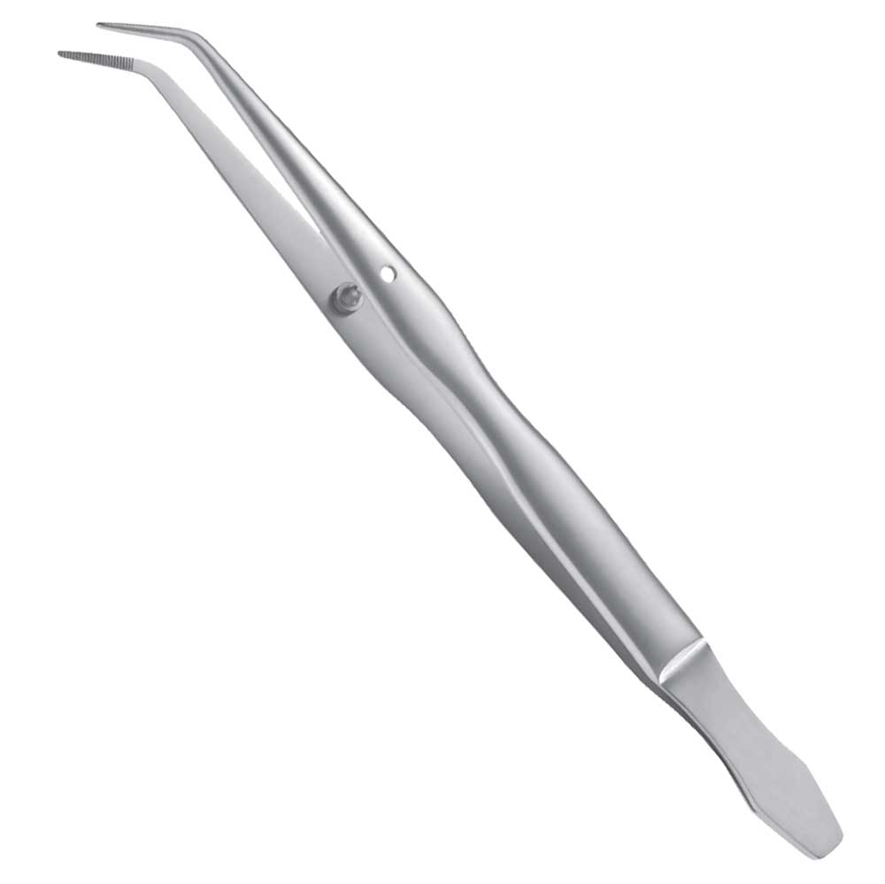 Stomatologická pinzeta z nerezovej ocele s ryhovanými čeľusťami zahnutá; celková dĺžka 15,7 cm.