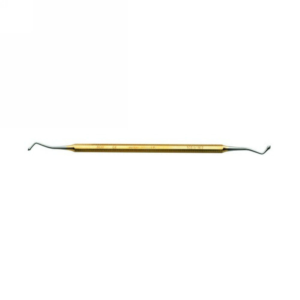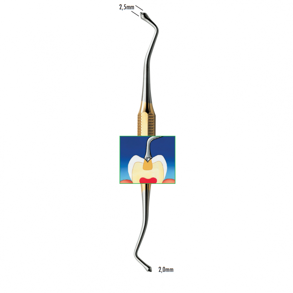 Obojstranný nástroj typu Boer z ušľachtilej ocele na spracovanie a tvarovanie výplní, vrátane fisúr. Konkávny tvar konca napomáha pri vytváraní konvexných plôch. Priemery hrotov 2,0 a 2,5 mm, celková dĺžka 16,7 cm.