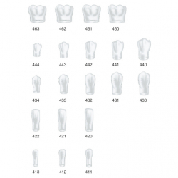 Priesvitné korunky nemeckého výrobcu Frasaco pre pravú dolnú časť chrupu, čísla 411 až 463.